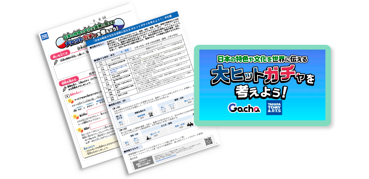 今回はその第七弾として、カプセルトイ(以下「ガチャ」)の商品とマシンを展開している株式会社タカラトミーアーツと連携した「社会科で学ぶガチャを通じて日本の特色や文化を考える探究プログラム」を提供いたします。